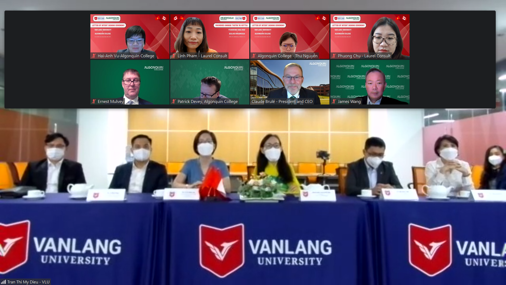 Tham dự trực tuyến từ thành phố Ottawa, thủ đô của Canada, đại diện trường Algonquin gồm có: Ông Claude Brule – Chủ tịch, kiêm Giám đốc Điều hành Algonquin College, Ông Ernest Mulvey – Giám đốc Trung tâm Đào tạo Quốc tế, Tiến sĩ Patrick Devey – Phó Chủ tịch khóa Đào tạo Toàn cầu trực tuyến, Ông James Zheng Wang – Giám đốc Tuyển dụng Quốc tế & Phát triển kinh doanh, Cô Vũ Hải Anh – RCIC Quản lý cấp cao khu vực Đông Nam Á, Cô Thư Nguyễn – Đại diện tại Việt Nam của trường Cao đẳng Algonquin.
