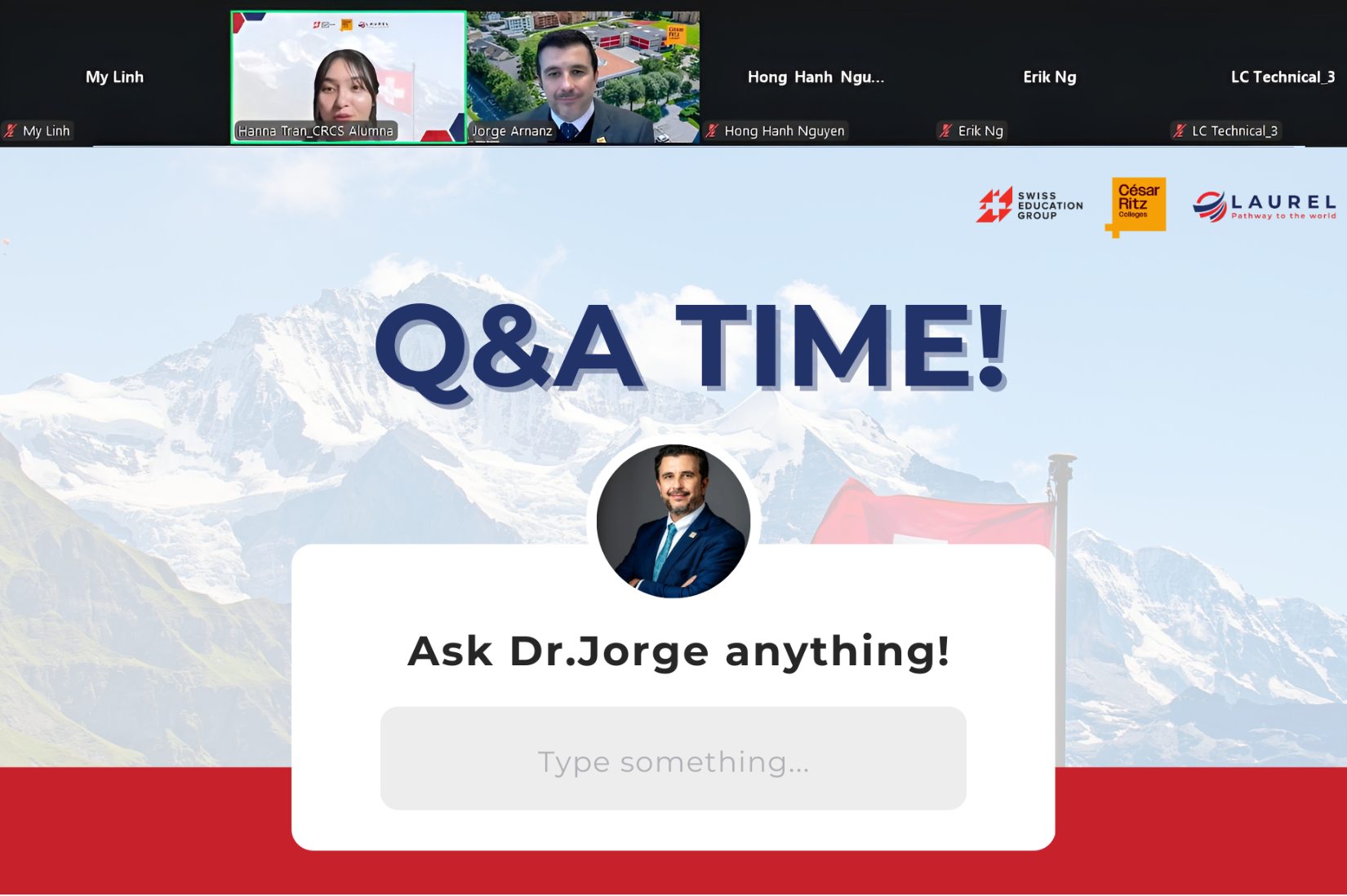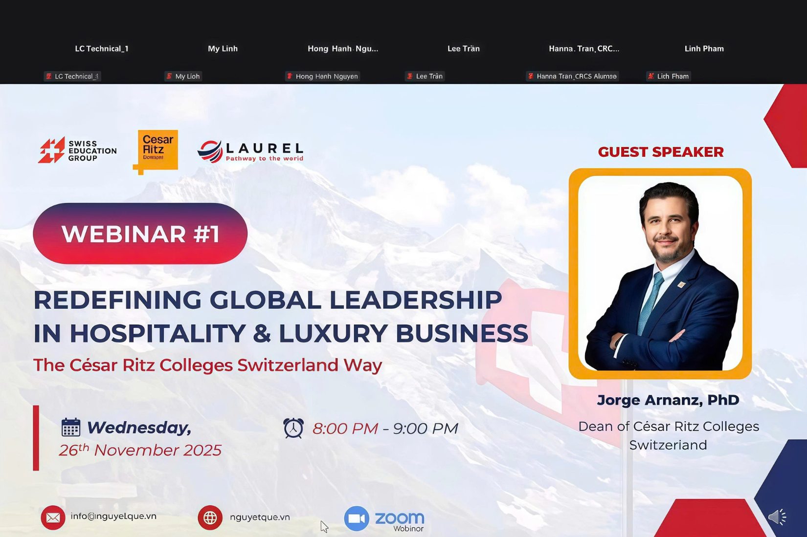 Buổi webinar là một phần trong chuỗi hội thảo độc quyền do Laurel phối hợp cùng César Ritz Colleges Switzerland, nhằm mang đến những góc nhìn học thuật chuẩn Thụy Sĩ và định hướng nghề nghiệp dài hạn cho thế hệ lãnh đạo tương lai trong ngành dịch vụ cao cấp.